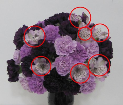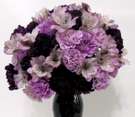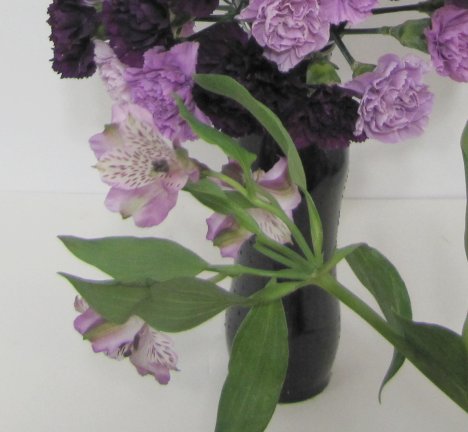 Finally . . . the bouquet is almost finished, but I want to break up the solid look of the carnations. They are different colors - but each carnations is still the same size and shape. I'm going to add a little more texture to the design with using the lavender alstroemeria (also known commonly as Peruvian Lilies).