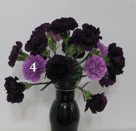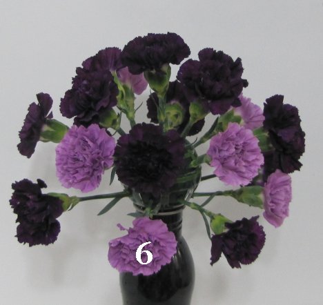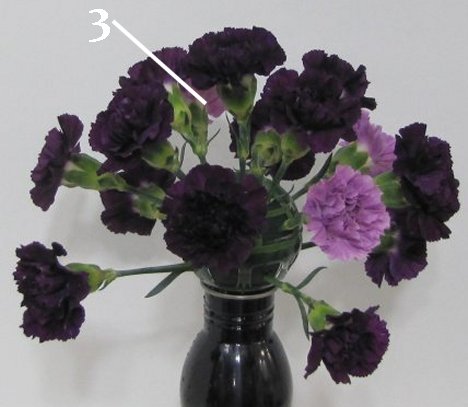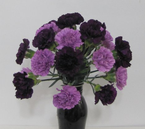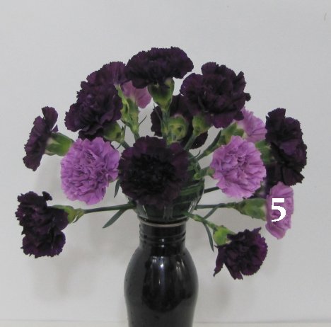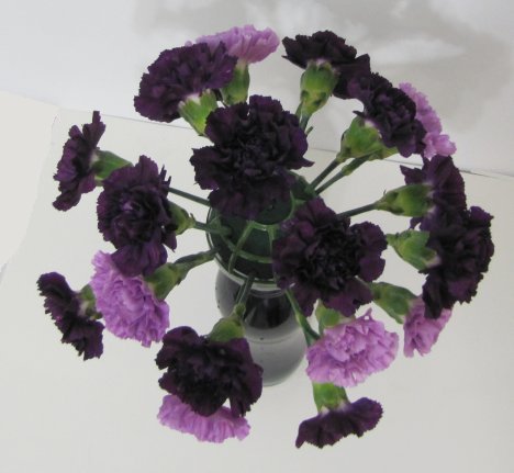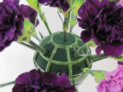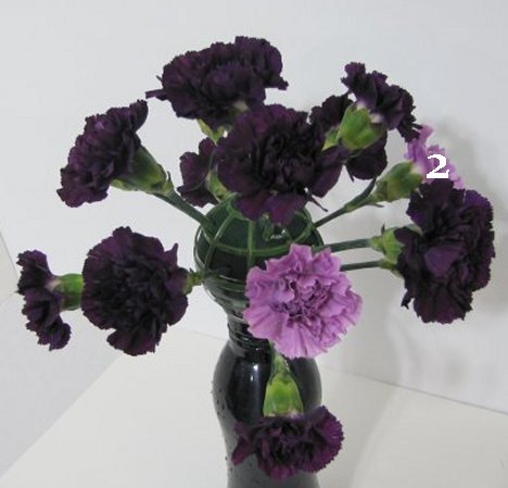 Carnations are available in purple shades from very deep to pale lavender. Start inserting the flowers in between the dark purple flowers already in the design.