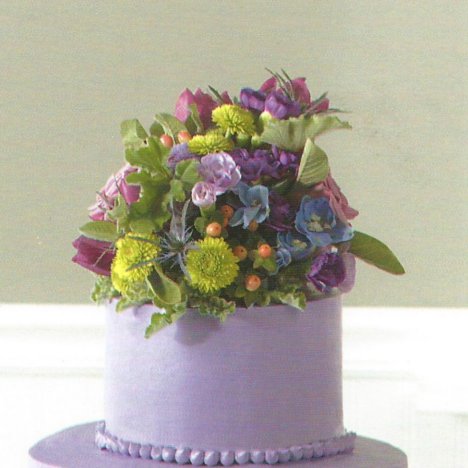 This purple wedding cake is accented with jewel colored flowers. They are easy to design and here is a list of the flowers and flower products that you need: