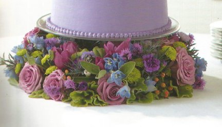 Design your fresh flowers in the Oasis Iglu. Put the finishing piece on top of cake under the disposable plate. You may ask your baker to put support dowels in the cake to support the topper.