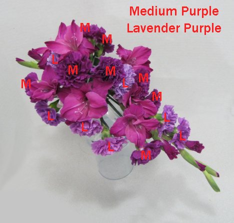 One trick to designing with carnations is to insert your overall flowers first (like above) and then begin to "layer" the flowers on top with a contrasting color. These flowers will end up at different depths. Doing this will create more depth contrast in your overall design, especially since they are all carnations.
