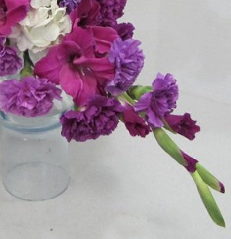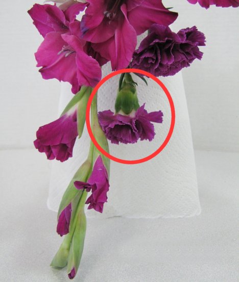 Add another carnation on the left bottom . Stagger the lengths so it isn't perfect, but that the cascade staggers down the longer bottom.
