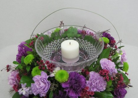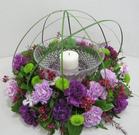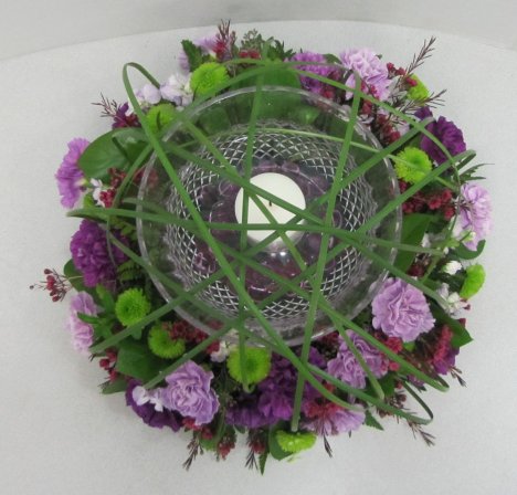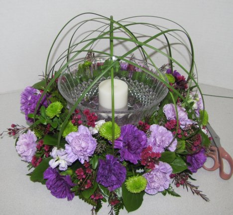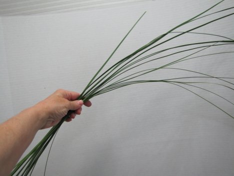 It is stiff enough to be bent, yet hold it's shape when each clean cut end is inserted into the foam. Start with one long steel grass blade is inserted into the wreath on the left, curved over the bowl and then the top of the blade inserted into the right side of the wedding wreath.