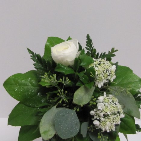 The first flower of this ranunculus bridal bouquet is adding white scabiosia. The delicate feathery blooms add a whimsical look nestled against the greenery. I placed on on the upper right and the lower down. The key is to face the flower heads in the center facing straight out, and then begin tilting the faces up, down and outwards to create a three dimensional look.