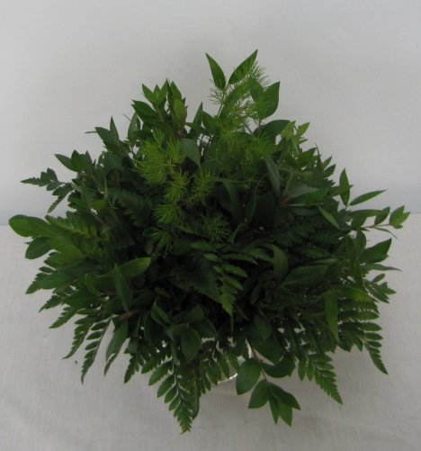 Stagger the lengths of your greens. When finished, you'll see the the length of your greens set the size of the overall design. You'll extend your flower tips just slightly beyond the leaves so the focus will be on the flowers.