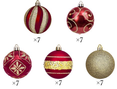 Red and gold christmas balls are almost 3" in diameter. They are shatterproof and luxuriously trimmed in gold accents.