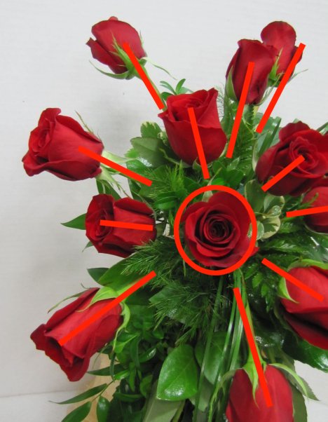 Can you visualize the triangle formed by all the flowers already in place? The dots represent where another rose head could be. How many roses are inserted is up to you.