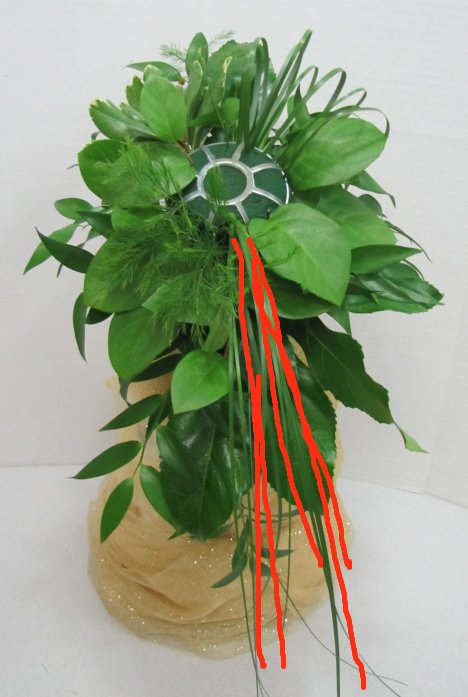 You actually can create a long, sweeping effect with the grass. I angled it slightly to the right so you can still see some of the Italian Ruscus and salal at the bottom. It's not about covering up your design elements, but rather blending them.