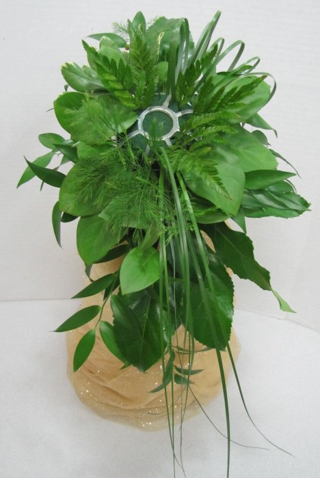 The greened in bouquet has pleasing, blended mixture of greens in different shapes and sizes.