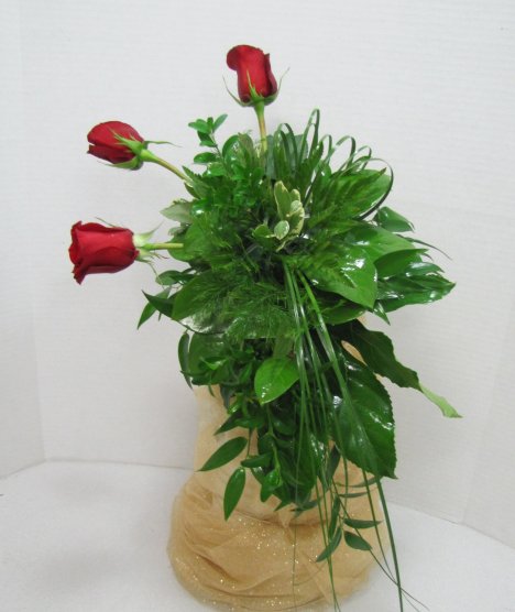 The third rose at a 90 degree angle to the first rose, tilted towards the back.
