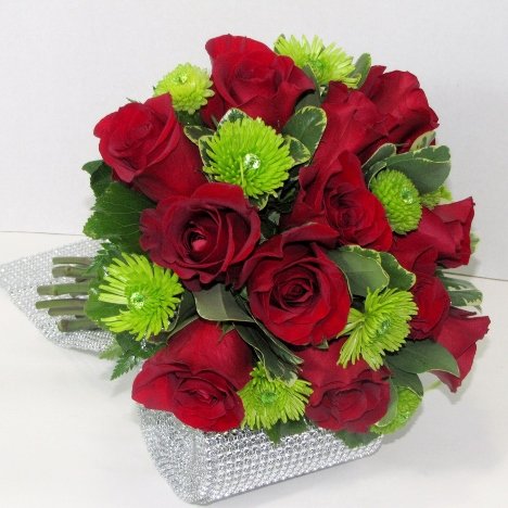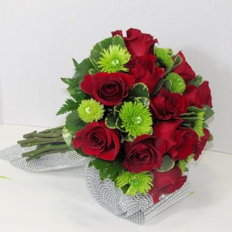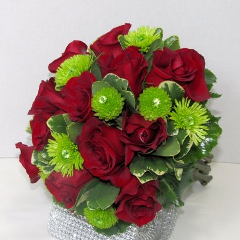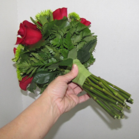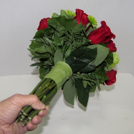 This lovely rose bouquet is about finished.  Here's a better view from the underside of the bouquet.  Your guests will never realize that this isn't a true hand tied design and your flowers will stay fresher since they have a water source throughout your wedding day!