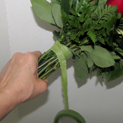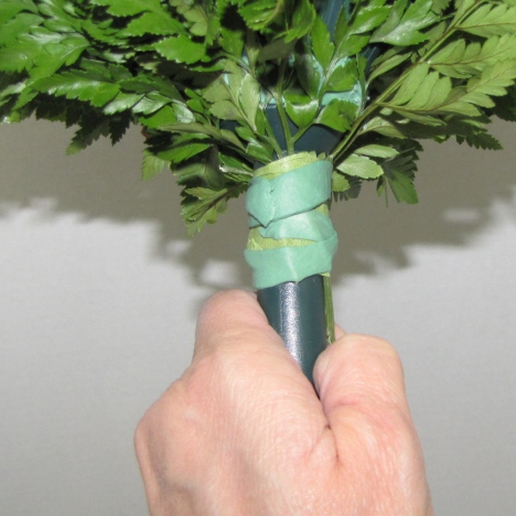 I then use florist tape to hold the stems in place around the bouquet handle. Pull as you tape, stretching it so it will adhere to itself.