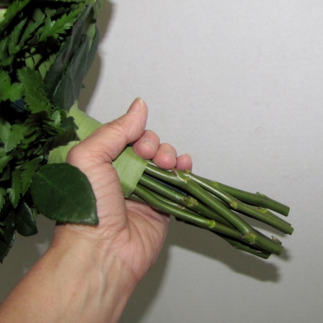 After I gather the stems in place, I squeeze tightly at the top so the cleaned stems will adhere to the floral clay.