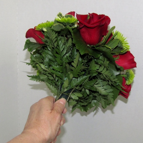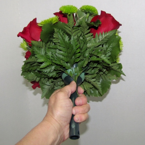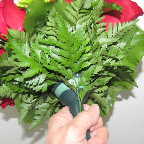 I'm adding more leather leaf fern to hide the bouquet holder from view. At this point, I'm facing the "good side" of the fern outward so it can be seen rather than the backside.