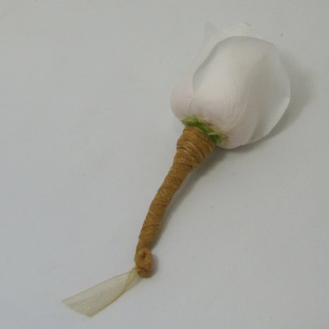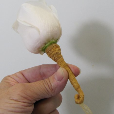 This rose boutonniere has a tightly wrapped ribbon and there is no danger of becoming unwound due to the twist at the bottom.