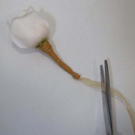 Placed the first loop against the front of the boutonniere, going about halfway down the stem.
