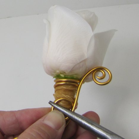 Clamp the wire armature to the boutonniere by squeezing the two middle loops firmly against the stem.
