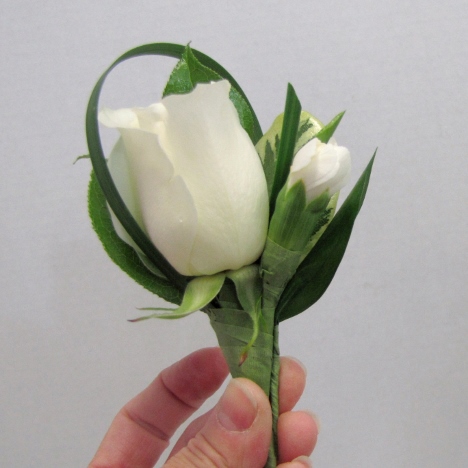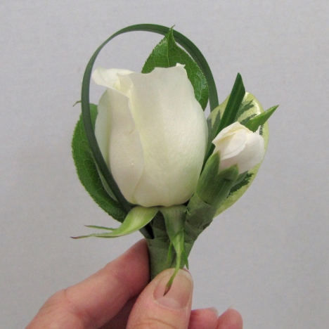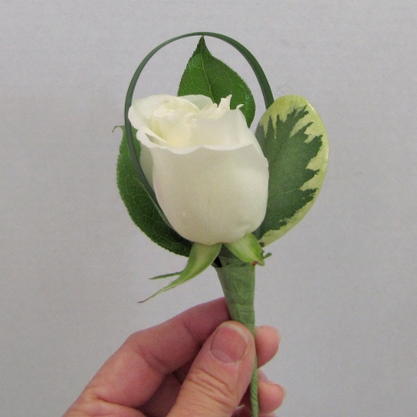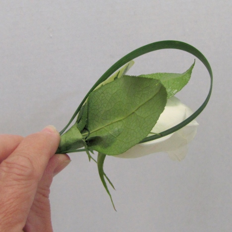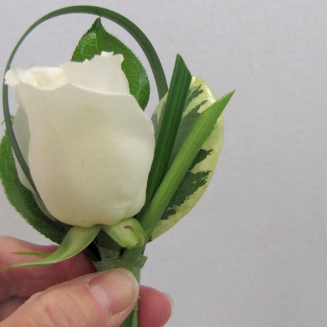 Bend the leaf outward and tuck into place under the miniature carnation on the right of the boutonniere.