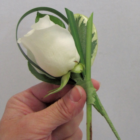 Add one or two of these short pieces, cutting the tops at sharp diagonal angles to add to the clean cut part of the boutonniere. Cut off the excess, especially not allowing the discolored root to show in your flower design.