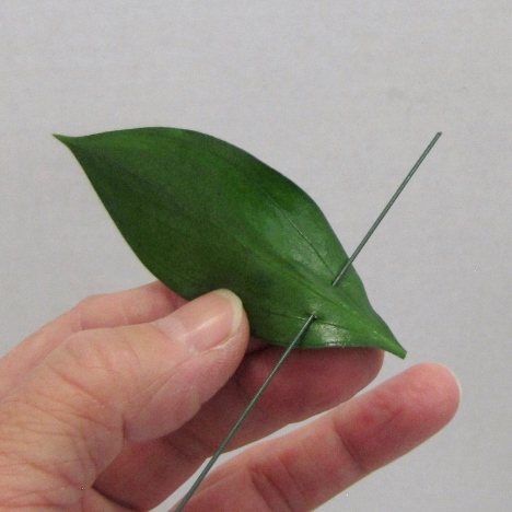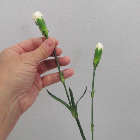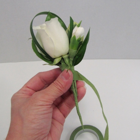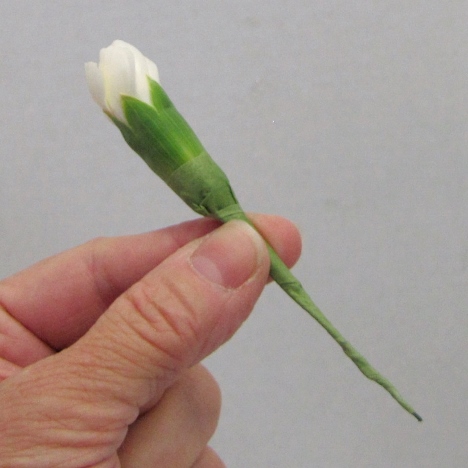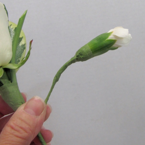 I wire the carnation by piercing it with a 26 gauge wire and folding down the wire parallel to the stem, then taping with green floral tape.