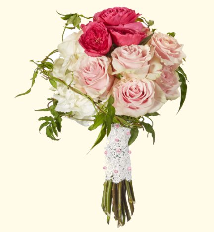 This rose hand tied bouquet is dainty and simple. A few roses gathered together and enhanced with ivy trailers. If you need more direction on creating hand tied bouquets, check out the step by step tutorials.