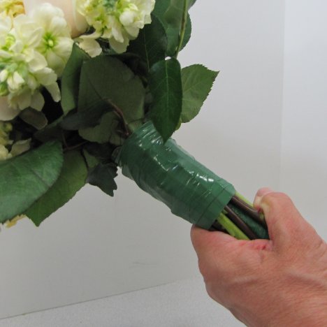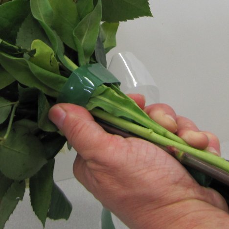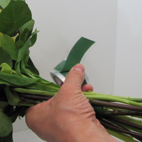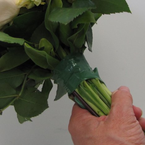 Rose wedding bouquets need a wrap or tape that securely holds the stems in place. BindIt tape is a newer product that I love. It comes in both green and clear.