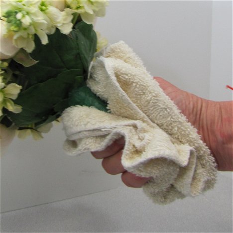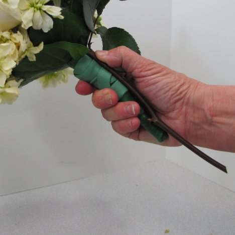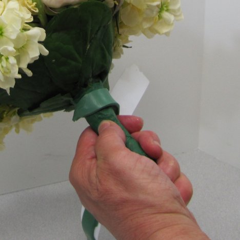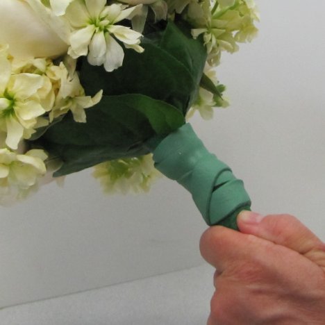 My rose wedding bouquets for this wedding called for a hand tie look. I'll show you how to create a hand tie design - but with a secret water source built in. Begin by drying off the bouquet handle, pressing lightly with a clean towel.
