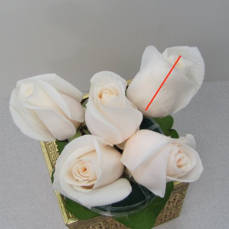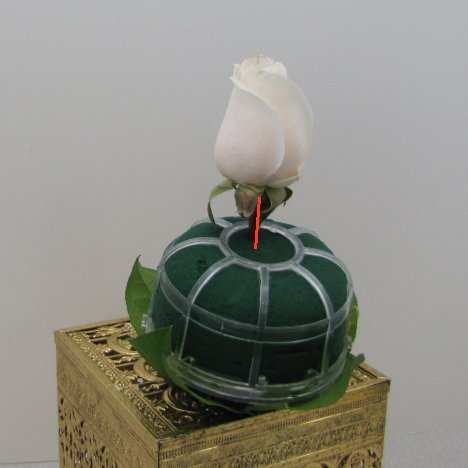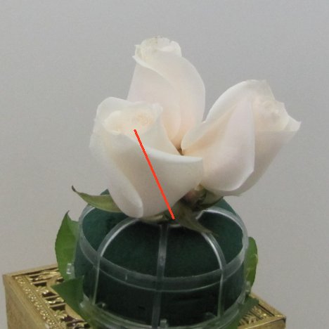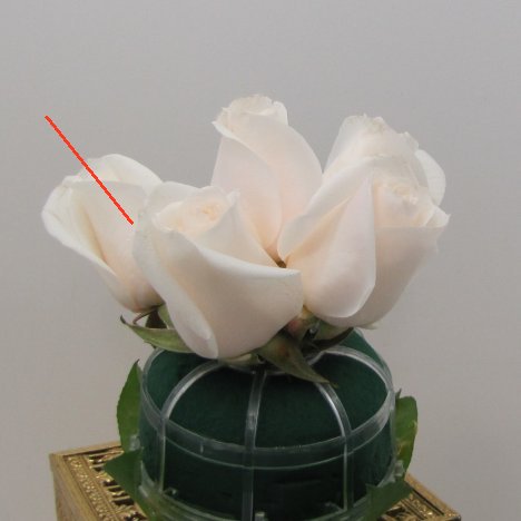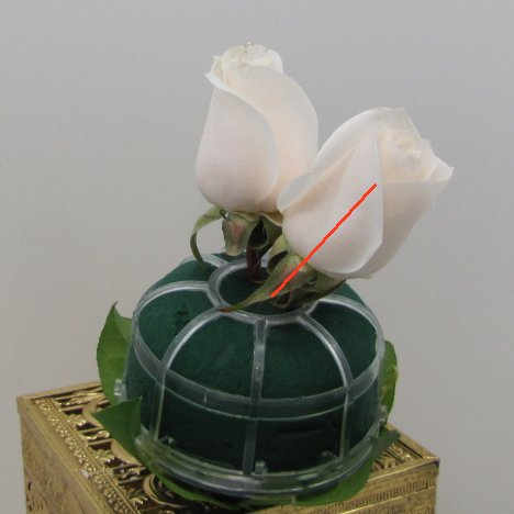 The first two roses are inserted in the center of the holder and tilt outwards towards the side of the bouquet.