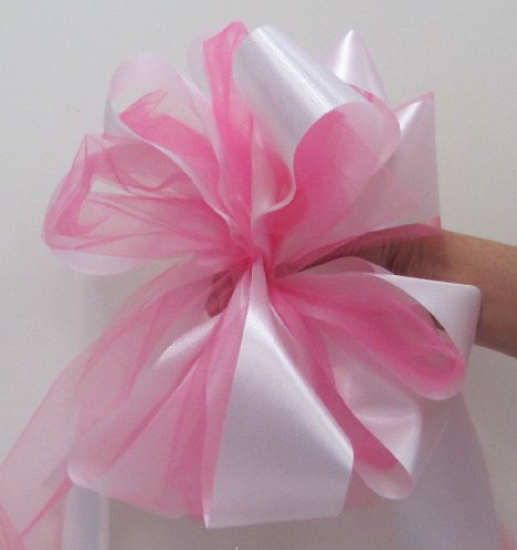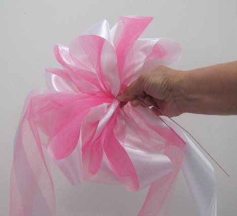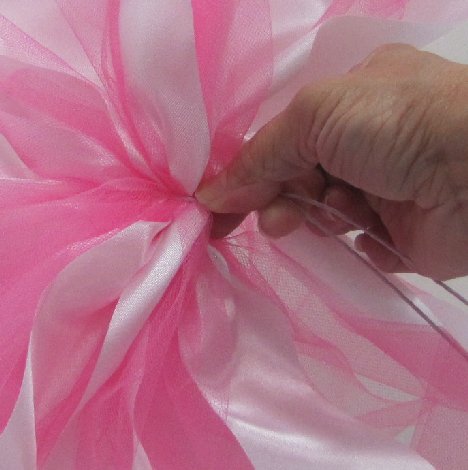 This satin and tulle pew bow should have six full loops on each side of both satin and ribbon. Hold the bow tightly and pick up the taped wire (you can see why you need the wire already prepared!)