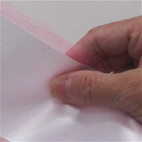 Lay the folded tulle UNDER the satin tulle (against the "wrong side) of the ribbon.