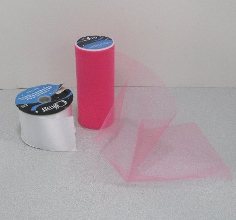 The two ribbons I'm going to use for this tutorial is a #40 (approximately 2 1/2" to 3" satin ribbon) and a contrasting color of 6" bolt tulle.