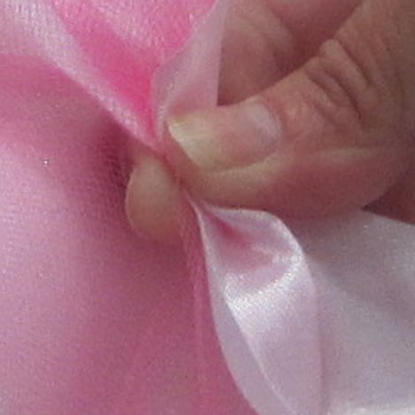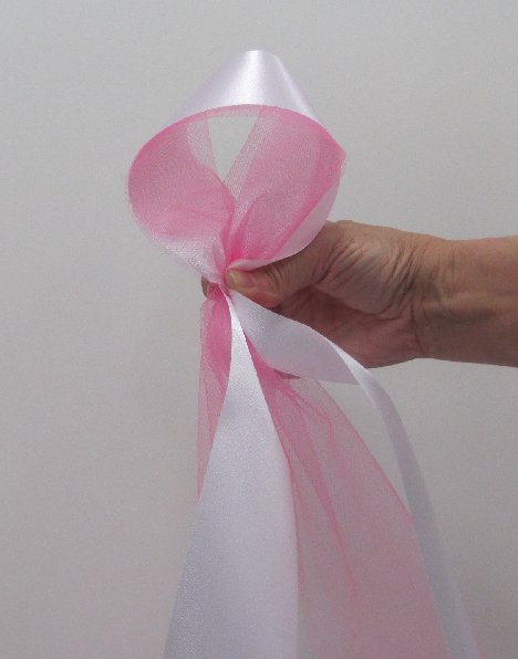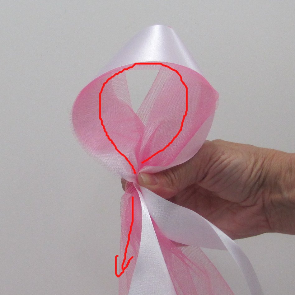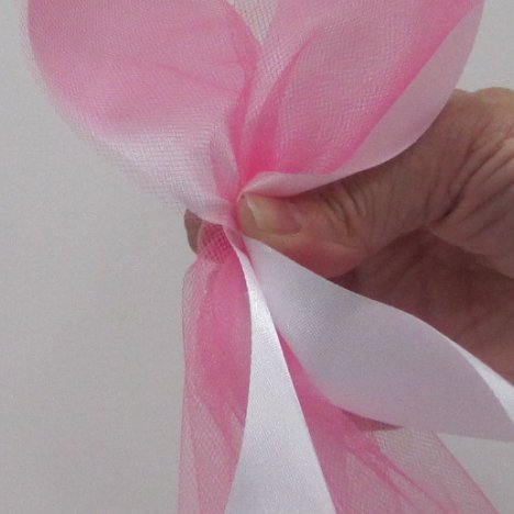My third finger on my right hand now pinches the outer tulle and ribbon that is dangling down.