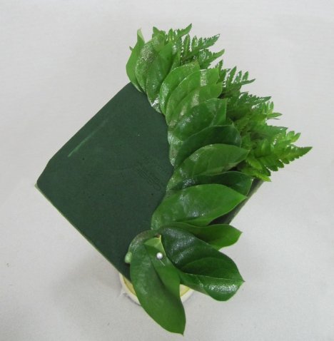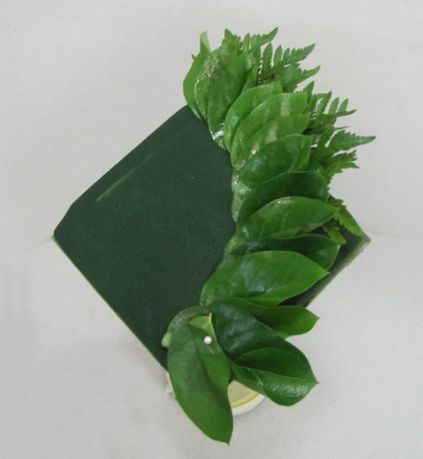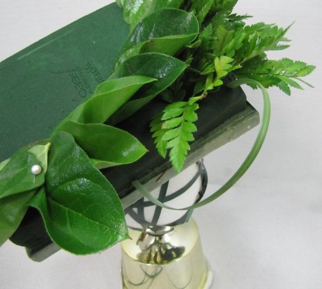 This greenery will hide the foam that shows on the sides of the bouquet, concealing the foam back of the holder.