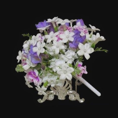 You then insert the stems one at a time into the bouquet, giving it an all around look. You can see why I covered the foam with the white stock, otherwise you would need a lot more stephanotis.