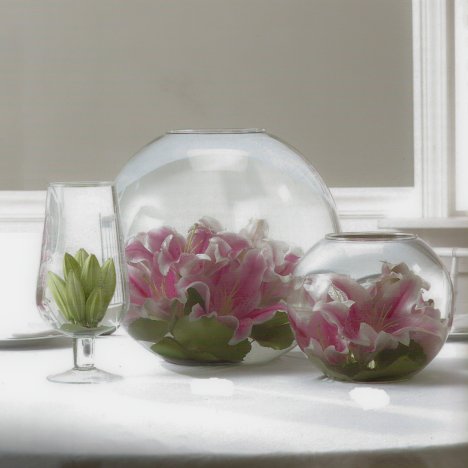 Submerged flower centerpieces work best in clear containers that the flower can be inserted down into without breaking or creasing the flower petals. From the moment the flowers are covered in water, the natural bacteria process begins, breaking down the composition of the flower. That is why you need to wait until the wedding day before completely submerging the flower heads in water.