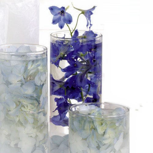 Submerged flower centerpieces look well in tall cylinder containers, creating a grouping that clusters in the center of the table in a pleasing arrangement. Staggering the heights of the vases and adding shorter votives also adds interest to the centerpiece. The Eastland Cylinder Vase set comes in four different heights, 6", 7.5", 9" and 10.5". They look well clustered in sets of four and arranged on a round table mirror. These are considered to be a "break away", which means the centerpiece is more than one single piece. Votive candles or floating candles on top of the submerged flowers add and element of light and visual interest to the centerpieces as well.
