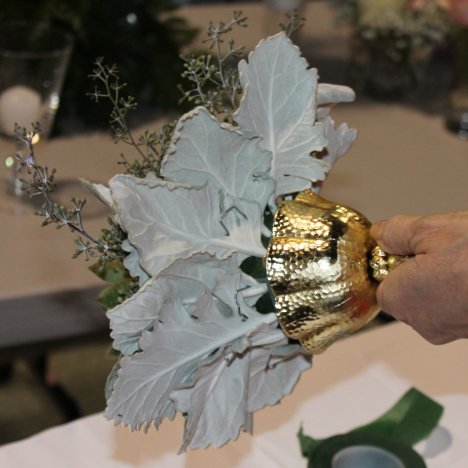 After pinning your succulent bouquet so the leaves stay forward, we'll move on to preparing the succulent blossom. Add a few smaller Dusty Miller leaves or seeded eucalyptus to conceal the greening pins.