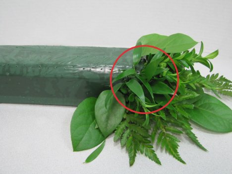 Here I've inserted a shortened piece of Italian ruscus into the corner of the spray bar.