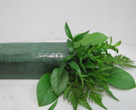 Shown here is a bunch of Italian ruscus. There is a variety of Israeli ruscus, which has larger and more rounded leaves. This variety has longer, slender leaves that can be cut off in shorter laterals.