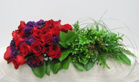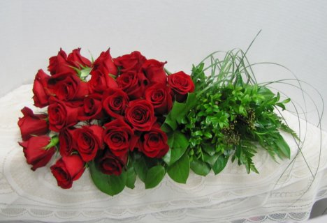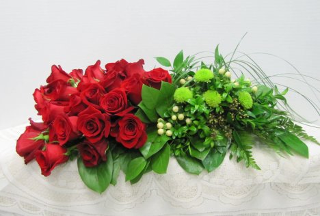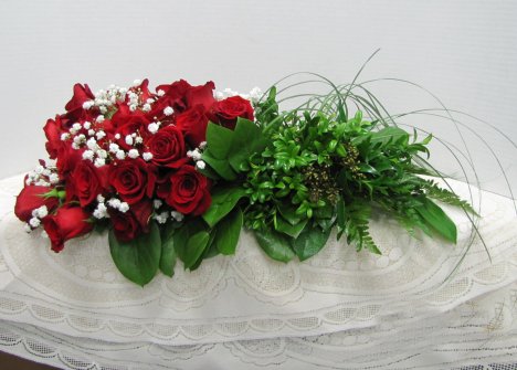 Table centerpieces can be continued greening, and then begin to flower into the greens. However, I finished this table centerpiece by finishing with tightly packed roses. Many brides love the total massed flower (no greens) look. They just don't realize how many flowers this takes. This one end alone took 24 roses when clustered this tightly. This is how high end florists can jack up the cost of arrangements for extravagant wedding designs without excess work needed nor much more hard goods product. This design can literally be done in under 10 minutes for a skilled florist, because you are simply "soaking and poking"!