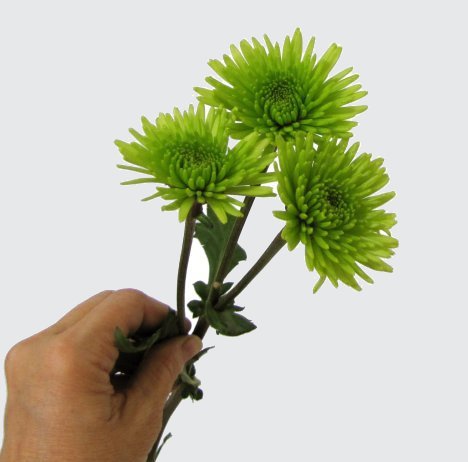 I'm now going to show you have to change the centerpiece. Instead of the more expensive rosews, you can adding more interest to the greened end by tucking in some other flower varieties in between the greens. Choose your own flower colors and varieties. Here is an inexpensive button chrysanthemum.