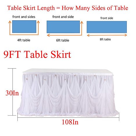Order one skirt for each 6' table you are covering. Start with a table covered with a top table cover and a ready made tulle skirt.