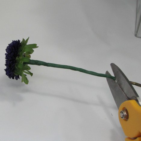 Use wire or bunch cutters to cut the stem shorter, as the wire can dull your floral knife.