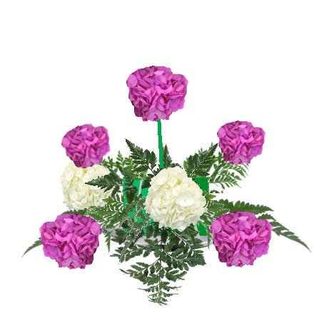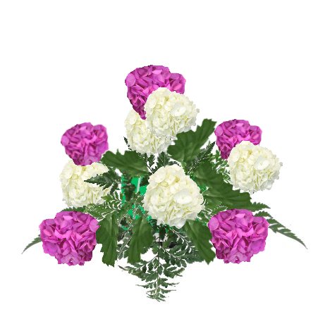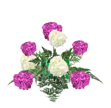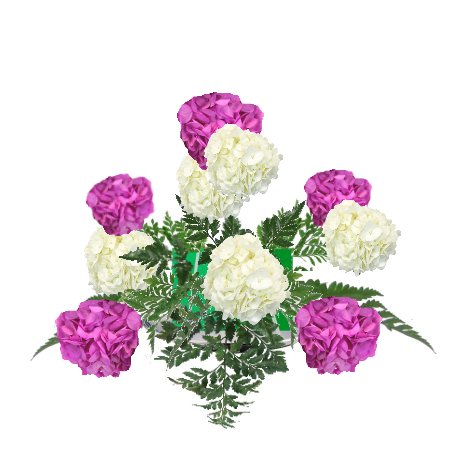 For the top center hydrangea, place the white one next to it, angled outward and a littler lower.