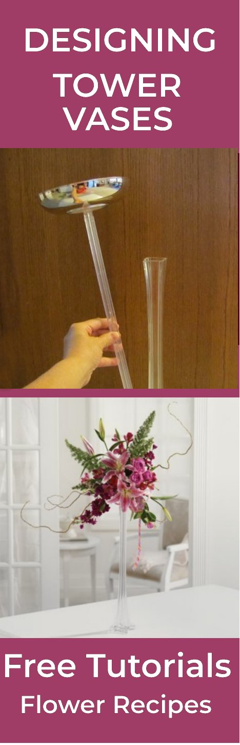 Tower vases are available all over the internet. I advise my brides to call around to see if local wedding renters have tall vases available for rent. This is usually a cheaper alternative than purchasing them. Shipping glass is heavy and can add a lot to your cost. Look for the tallest Tower vase you can find (usually 32"). You always want to keep your centerpieces either high enough or low enough so to allow your guests to be able to see each other's faces and converse at the reception dinner.