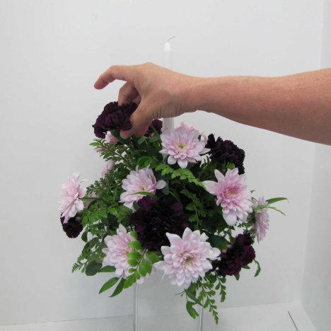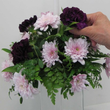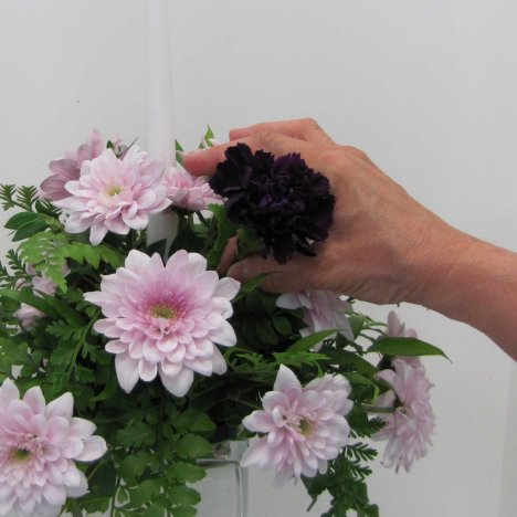 I'm inserting these in between the light lavender cushion mums. Make the stems of the carnations a little longer than the mums.