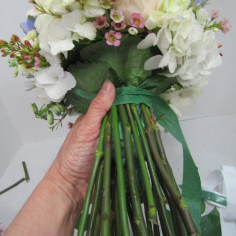 Using either wide florist tape or the new BindIt tape by Oasis, start at the very top of the neck of the bouquet, taking care to conceal the cut ends of the flower stems.