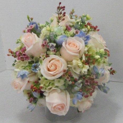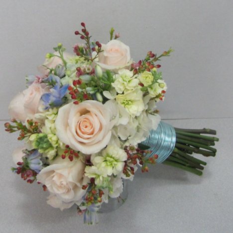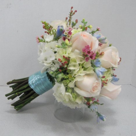 This beautiful hydrangea wedding bouquet is done . . . except for a few finishing touches.
