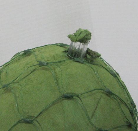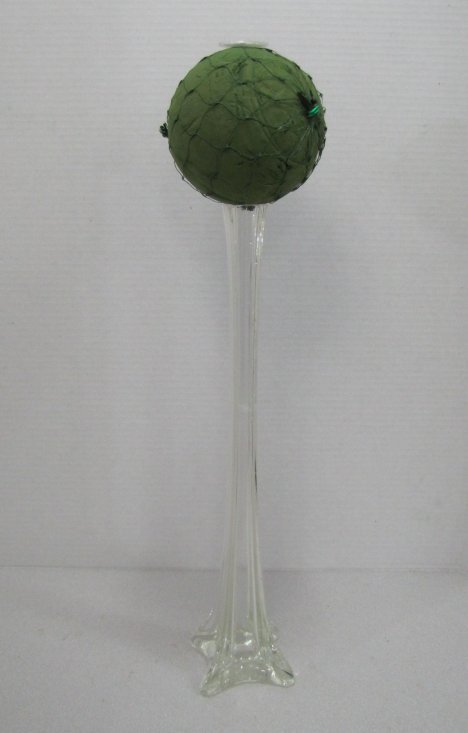 Soak the sphere and carefully insert the rod through the ball and down into the vase. You will probably need to use a larger round mirror on the table and put florist clay on the bottom four points of the vase. Press hard on top of the mirror until the Tower vase is firmly attached to the vase. The mirror on the bottom will help stabilize the vase on the table top to keep it from toppling over.