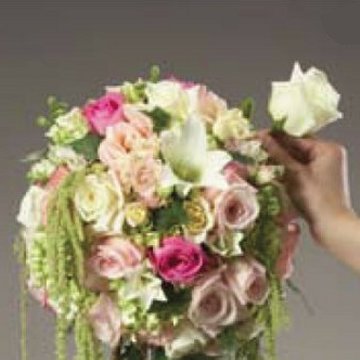 This flower ball features white roses, blush roses, Asiatic Lilies, hanging amaranthus and sweet heart roses. For additional help on how many flowers it takes for your size floral foam sphere and how to flower in pomanders, check out wedding reception centerpieces.